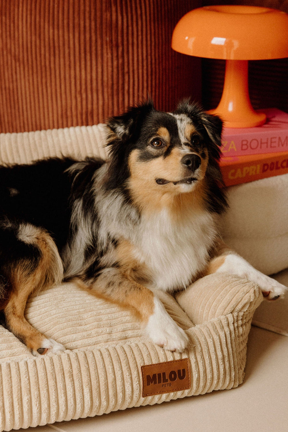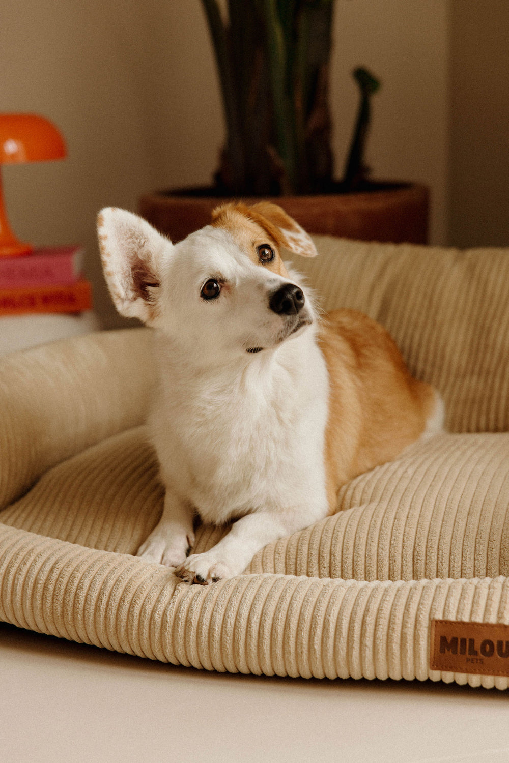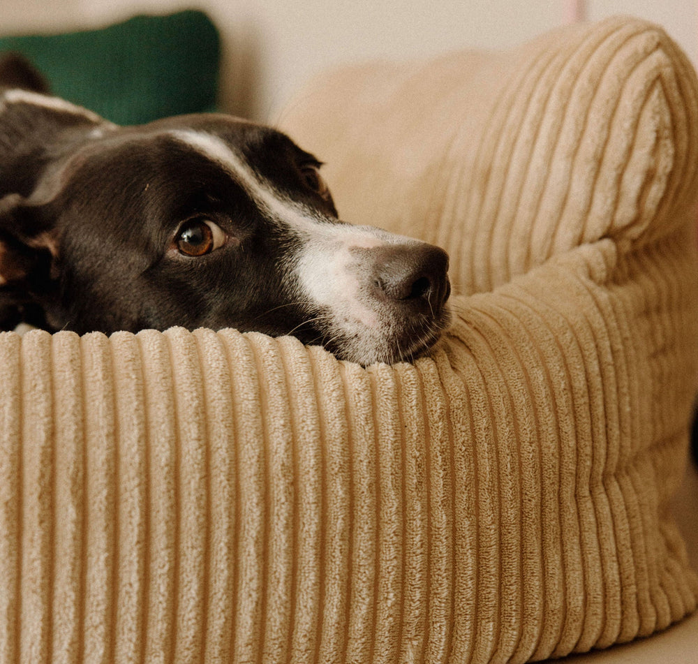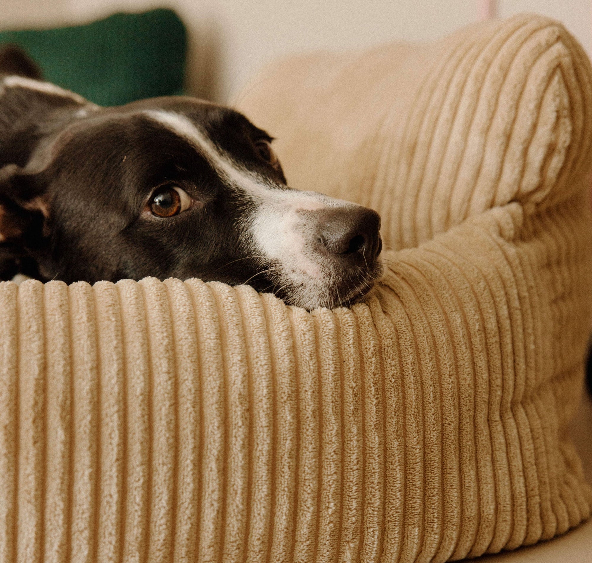 Le Canapé Simone, pensé comme un véritable objet déco, offre un design sobre et intemporel qui s’intègre naturellement dans tous les intérieurs. Après un an de développement et de tests, il allie bien-être, design et durabilité grâce à son velours côtelé en polyester recyclé, ses coutures renforcées, ses zips robustes et ses coussins protégés par une sous-housse en polyester recyclé. Son rembourrage en fibres recyclées reste durablement moelleux, et son assise en mousse à mémoire de forme haute densité offre un soutien idéal pour tous les chiens, qu’ils soient jeunes ou âgés.