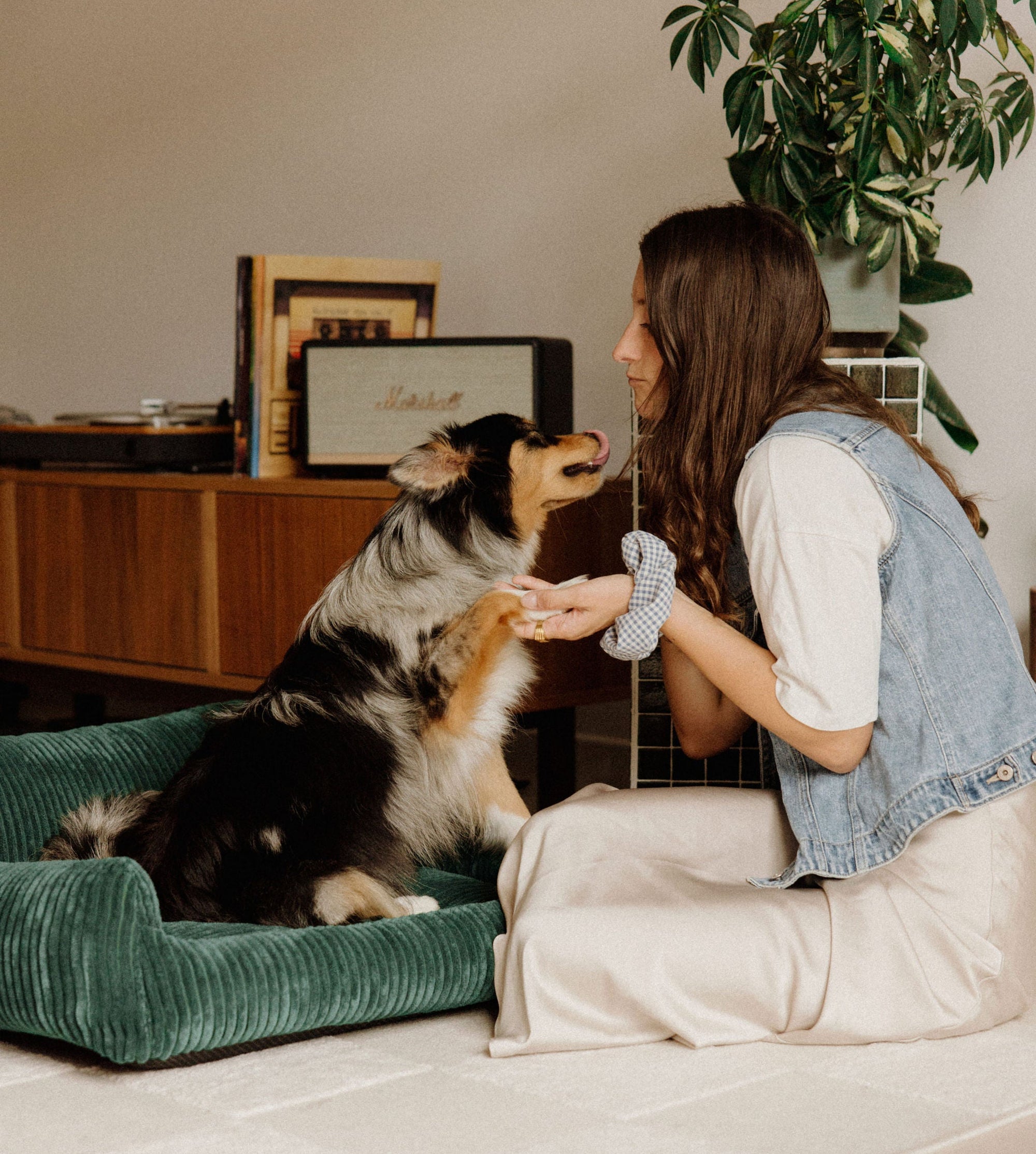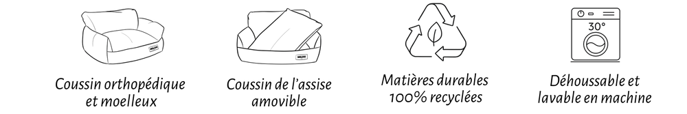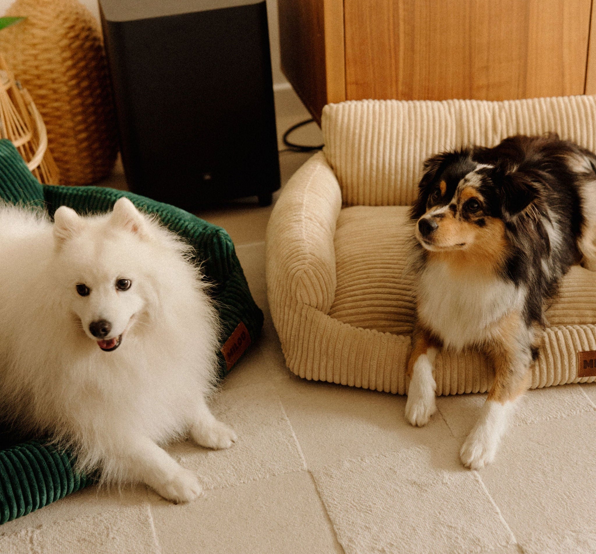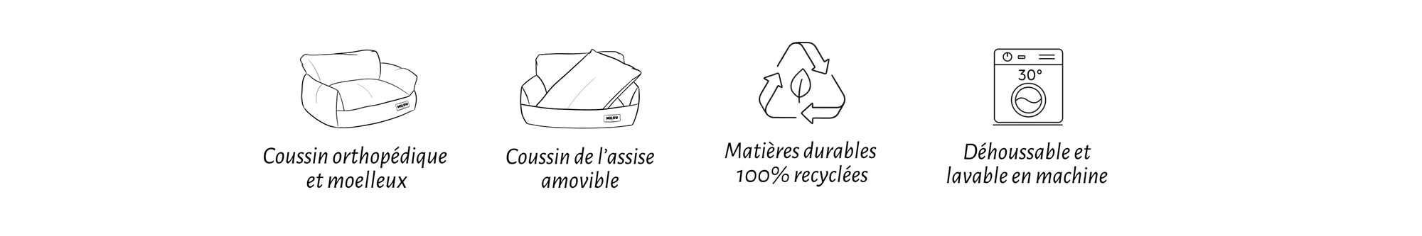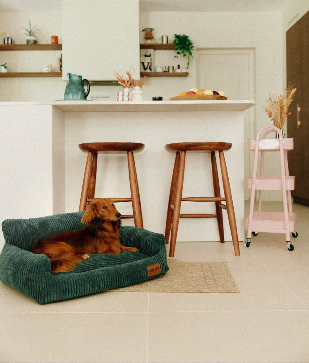 Le Canapé Simone, pensé comme un véritable objet déco, offre un design sobre et intemporel qui s’intègre naturellement dans tous les intérieurs. Après un an de développement et de tests, il allie bien-être, design et durabilité grâce à son velours côtelé en polyester recyclé, ses coutures renforcées, ses zips robustes et ses coussins protégés par une sous-housse en polyester recyclé. Son rembourrage en fibres recyclées reste durablement moelleux, et son assise en mousse à mémoire de forme haute densité offre un soutien idéal pour tous les chiens, qu’ils soient jeunes ou âgés.